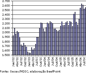 No período acumulado de janeiro a agosto de 2006, as exportações de carne bovina in natura somam 780,3 mil toneladas, com receita de US$ 1.925,9 milhões. No período acumulado, o preço médio foi de US$ 2.468/tonelada. Ainda assim, houve queda de 0,33% no volume embarcado. A receita cresceu 11,80% e o preço médio 12,17%.