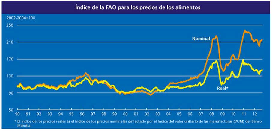 O índice da FAO está abaixo do pico de 238 pontos atingidos em fevereiro de 2011, quando os altos preços dos alimentos ajudaram a estimular as revoltas da Primavera Árabe no Oriente Médio e Norte da África, mas os níveis atuais estão muito próximos àqueles vistos em 2008, que levou a conflitos nos países pobres.
