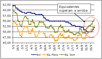 Veja que, em setembro, foi a primeira vez no ano que as cotações dos equivalentes alcançaram, ou superaram, o preço da arroba. A carne praticamente empatou com o boi. Considerando o couro e o sebo, os frigoríficos trabalhavam com margem de 7% no fechamento desta análise (27/9).