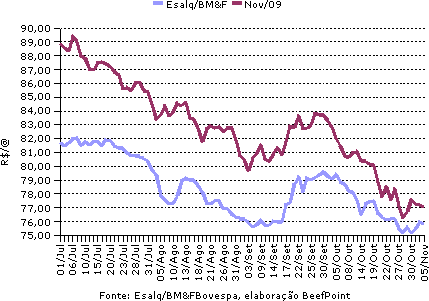 Na BM&FBovespa, o primeiro vencimento, novembro/09, registrou retração de R$ 0,13, fechando a R$ 77,05/@, com 2.489 contratos negociados e 7.952 contratos em aberto. Os contratos com vencimento em dezembro/09 fecharam a R$ 77,64/@, com variação positiva de R$ 0,24.
