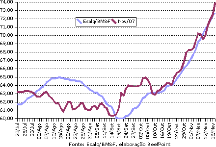 O indicador Esalq/BM&F boi gordo à vista foi cotado a R$ 72,70/@, alta de R$ 0,31. Já o equivalente a prazo registrou variação maior, +R$ 0,46, sendo cotado a R$ 73,76/@. Na BM&F, alta em todos os vencimentos. Os contratos que vencem em novembro/07 tiveram alta de R$ 1,48, fechando a R$ 73,95/@. Dezembro/07 foi o vencimento que apresentou maior variação, +R$ 1,88, fechando a R$ 71,16/@. No mercado físico, as compras de boi gordo para abate continuam dificultadas, mantendo as escalas curtas e provocando alta no preço da arroba.