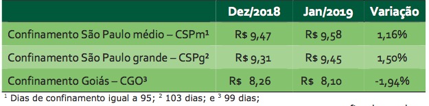 Tabela 1. Comparativo de custos da diária-boi (CDB) entre os meses de dezembro de 2018 e janeiro de 2019