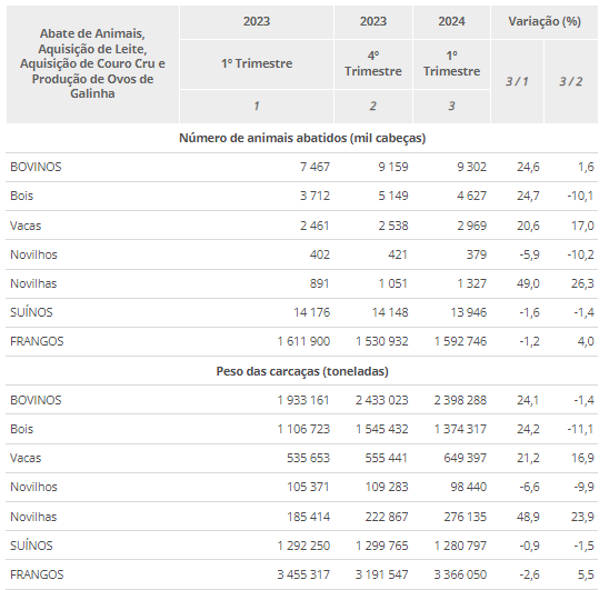 Fonte: IBGE – Diretoria de Pesquisas, Coordenação de Agropecuária – Pesquisa Trimestral do Abate de Animais, Pesquisa Trimestral do Leite, Pesquisa Trimestral do Couro e Pesquisa da Produção de Ovos de Galinha.