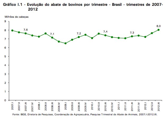 No 3° trimestre de 2012 (3T12), o abate de bovinos atingiu a marca recorde de 8,027 milhões de cabeças abatidas (Gráfico I.1). Esse valor foi 5,0% maior que o registrado no trimestre anterior e 10,2% superior ao registrado no mesmo período de 2011. O valor mais alto na série histórica do abate de bovinos, desde 1997, havia sido alcançado no 1º trimestre de 2007, com a marca de 7,957 milhões de cabeças abatidas.