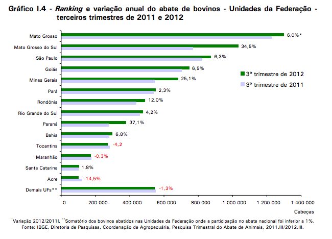 No ranking do abate de bovinos, as dez primeiras Unidades da Federação e Santa Catarina apresentaram aumentos no comparativo dos terceiros trimestres 2012/2011 (Gráfico I.4). Todas essas, com exceção de São Paulo, que é a principal origem da carne bovina in natura exportada do Brasil, apresentaram aumentos na exportação em relação ao 3º trimestre de 2011 (Tabela I.2; Secex, 2012).