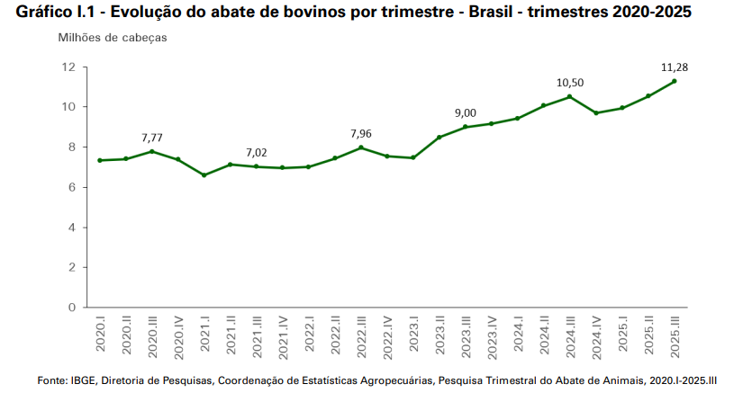 No 3º trimestre de 2025, foram abatidas 11,28 milhões de cabeças de bovinos sob algum tipo de serviço de inspeção sanitária. Essa quantidade foi 7,4% superior à obtida no 3° trimestre de 2024 e 7,1% acima da registrada no trimestre imediatamente anterior. Esse total de cabeças marcou recorde de toda a série histórica, superando o recorde registrado no 2º trimestre de 2025 (10,53 milhões de cabeças).
