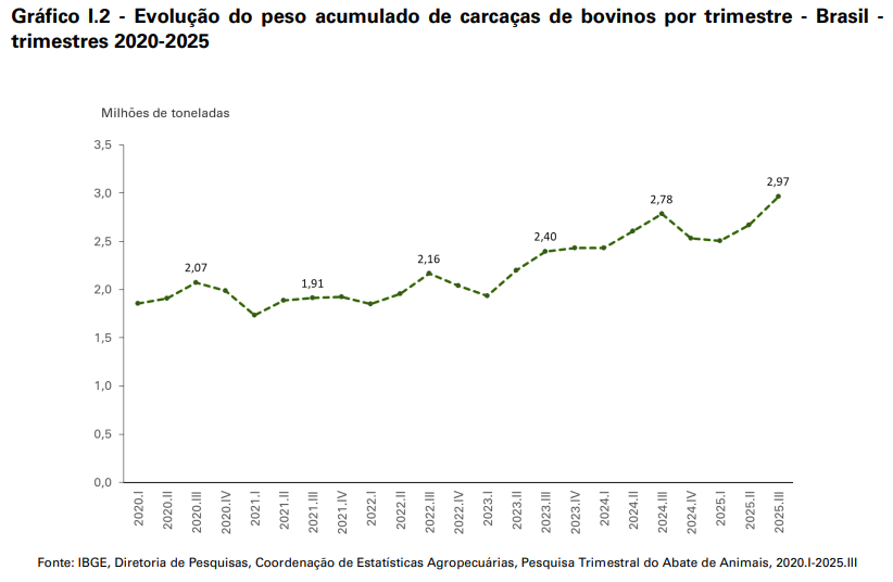 No 3º trimestre de 2025, o peso médio de carcaças bovinas foi de 262,93 kg, variação negativa de 0,8% em relação ao trimestre equivalente de 2024, mas um aumento de 3,8% em comparação ao trimestre imediatamente anterior.