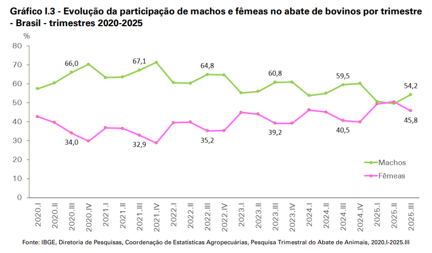 O abate de animais machos totalizou 6,12 milhões de cabeças, sendo que os bois (machos com dois anos ou mais) representaram 91,9% desse montante. O abate de machos adultos apresentou um decréscimo de 3,5%, enquanto o de novilhos aumentou 17,7% em comparação ao 3° trimestre de 2024. Em relação ao 2º trimestre de 2025, o abate de bois apresentou variação positiva de 16,2%, o mesmo ocorrendo com o de novilhos, que registrou aumento de 29,5%. No período desta pesquisa, o peso médio das carcaças foi de 303,39 kg e 279,31 kg para bois e novilhos, respectivamente, enquanto a média para vacas e novilhas foi, por essa ordem, 218,22 kg e 215,47 kg.