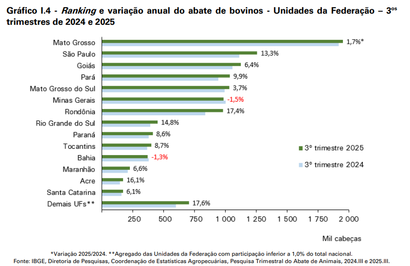 O abate de cerca de 778,40 mil cabeças de bovinos a mais no 3º trimestre de 2025, em relação ao mesmo período do ano anterior, foi impulsionado por aumentos em 23 das 27 Unidades da Federação (UFs). Entre aquelas com participação acima de 1,0%, as variações mais significativas ocorreram em: São Paulo (+147,34 mil cabeças), Rondônia (+145,09 mil cabeças), Pará (+93,31 mil cabeças), Goiás (+67,46 mil cabeças), Rio Grande do Sul (+58,03 mil cabeças), Mato Grosso do Sul (+37,19 mil cabeças), Mato Grosso (+32,90 mil cabeças), Paraná (+32,61 mil cabeças), Tocantins (+31,89 mil cabeças), Acre (+23,68 mil cabeças), Pernambuco (+18,23 mil cabeças), Maranhão (+13,93 mil cabeças) e Santa Catarina (+9,75 mil cabeças). O destaque negativo fica por conta de Minas Gerais (-15,19 mil cabeças) e da Bahia (-4,80 mil cabeças). No ranking das UFs, Mato Grosso continua liderando o abate de bovinos, com 17,3% da participação nacional, seguido por São Paulo (11,2%) e Goiás (10,0%) (Gráfico I.4).