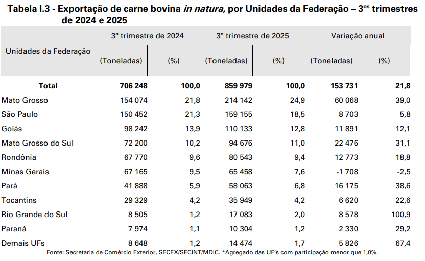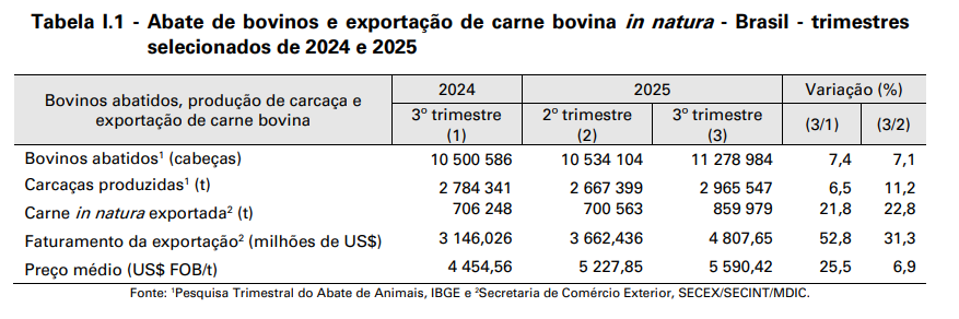 O mês de maior atividade foi julho, também recorde de toda a série histórica, quando foram abatidas 3,85 milhões de cabeças, 6,0% a mais do que no mesmo mês do ano anterior. Além disso, as exportações impulsionaram a atividade, pois cresceram cerca de 21,8% (859,98 milhões de toneladas no terceiro trimestre em 2025 contra 706,25 milhões de toneladas no mesmo trimestre em 2024).