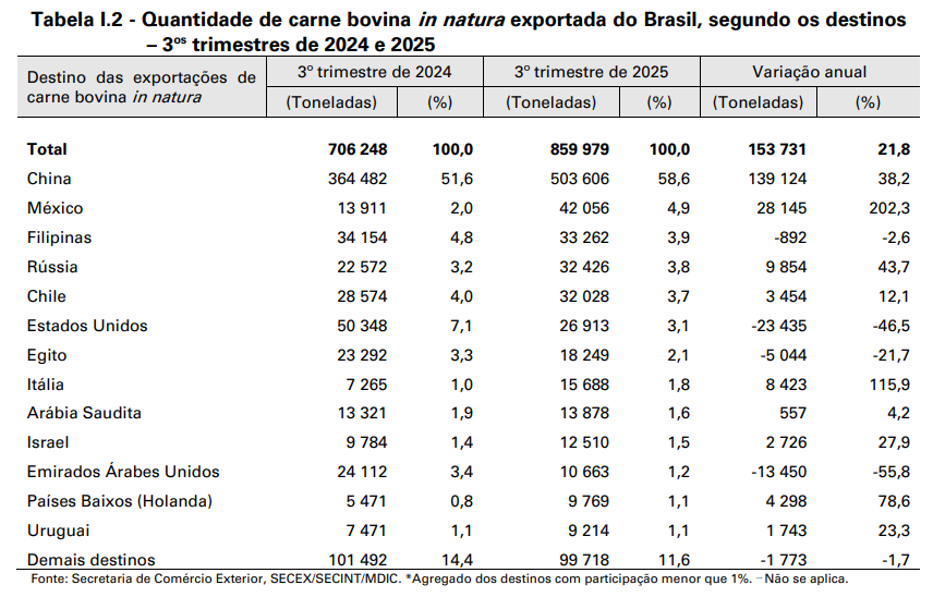 No 3° trimestre de 2025, as exportações brasileiras de carne bovina in natura aumentaram 21,8% na comparação com o 3° trimestre de 2024 e tiveram a China como principal destino (58,6% de participação), seguido por México (4,9%), Filipinas (3,9%), Rússia (3,8%), Chile (3,7%) e Estados Unidos (3,1%). Com o regime do “tarifaço” imposto pelos Estados Unidos ao Brasil, a demanda dos Estados Unidos por carne bovina in natura brasileira diminuiu, tornando este destino o sexto colocado no ranking dos principais destinos. Em contrapartida, o México, que já vinha ampliando suas compras, figurou na segunda posição no ranking. Na comparação entre os 3os trimestres 2025/2024, o aumento das exportações de carne bovina in natura brasileira aconteceu sobretudo por incrementos da China (+139,12 mil toneladas), do México (+28,15 mil toneladas) e da Rússia (+9,85 mil toneladas). Em contrapartida, os Estados Unidos reduziram suas importações (-23,44 mil toneladas), assim como Emirados Árabes Unidos (-13,45 mil toneladas) (Tabela I.2).