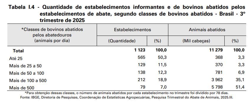 Levando em consideração a capacidade dos estabelecimentos, 51,4% desta atividade foi realizada em unidades capazes de abater mais de 500 animais por dia, o que correspondeu a 7,0% dos estabelecimentos levantados pela Pesquisa. Logo em seguida, os estabelecimentos com capacidade de abater entre 100 e 500 bovinos por dia efetuaram 35,1% do abate nacional (Tabela I.4).