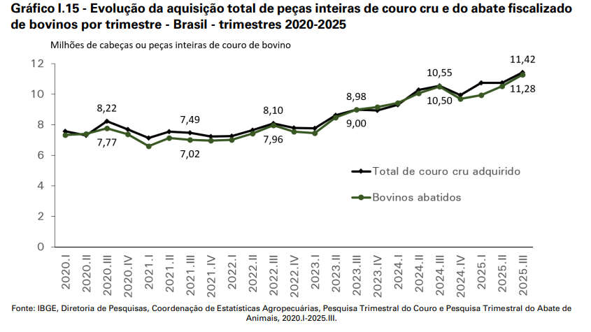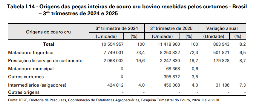 No 3º trimestre de 2025, os curtumes investigados pela Pesquisa Trimestral do Couro – aqueles que efetuam curtimento de pelo menos 5.000 unidades inteiras de couro cru bovino por ano – declararam ter recebido 11,42 milhões de peças de couro. Esse total representa aumento de 8,2% em relação ao mesmo trimestre do ano anterior e acréscimo de 6,2% em comparação com o trimestre anterior. Quanto à origem do couro, a maior parte teve procedência de matadouros frigoríficos (72,3%), seguida pela prestação de serviços (19,7%), que responderam juntas a aproximadamente 92,0% do total captado no período (Tabela I.14).