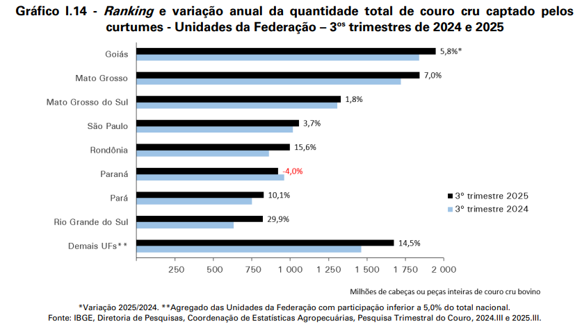 No total, 17 Unidades da Federação possuíam curtumes elegíveis pelo universo da pesquisa. Das 8 UFs que participaram com 5,0% ou mais na aquisição de couro nacional, as variações positivas mais expressivas na aquisição ocorreram em Rio Grande do Sul (+189,03 mil peças), em Rondônia (+134,83 mil peças) e em Mato Grosso (+121,12 mil peças). A principal queda ocorreu no Paraná (-38,37 mil peças).