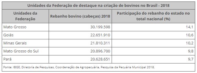 O efetivo de bovinos registrou em 2018 a segunda queda consecutiva (-0,7%), totalizando 213,5 milhões de animais. Em 2017 o rebanho diminuiu 1,5% frente a 2016. O ano de 2018 foi marcado por crescimento do abate e recorde de volume de carne bovina exportada. O Mato Grosso, que desde 2004 é líder na criação desses animais, respondeu por 14,1%, mas o município com maior quantidade de bovinos pertence à região Norte – São Félix do Xingu (PA).