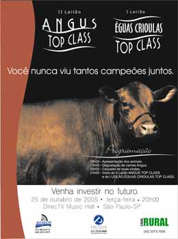 A Chalet Agropecuária, Casa Branca Agropastoril, Reconquista Agricultura e Pecuária, GB Agropecuária, VPJ Red Angus e convidados promovem, dia 25 de outubro, terça-feira, a segunda edição do leilão Angus Top Class, que será realizado no Direc TV Music Hall em São Paulo a partir das 20h.