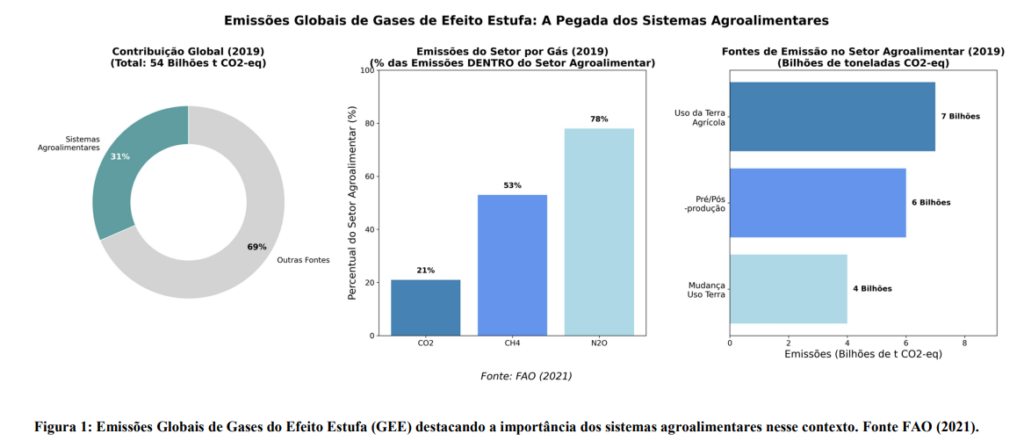 Em 2019, as emissões globais de origem antropogênica totalizaram 54 bilhões de toneladas de dióxido de carbono equivalente (CO2-eq). Desse montante, uma parcela expressiva — 17 bilhões de toneladas (31%) — foi atribuída diretamente aos sistemas agroalimentares. A distribuição dessas emissões e a contribuição específica do setor podem ser visualizadas na Figura 1.