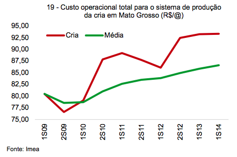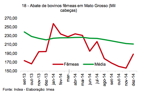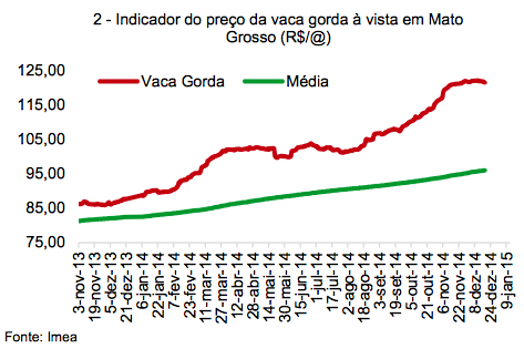 O preço da vaca ficou mais próximo ao do boi, tendo a diferença entre eles passado de 10,35% em 2013 para 7,71% em 2014. O abate total de 2014 fechou 8,5% menor que o de 2013, ou seja, 500 mil cabeças a menos foram encaminhadas aos frigoríficos de Mato Grosso.