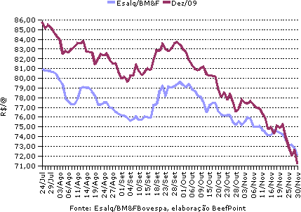 A BM&FBovespa fechou com forte desvalorização, registrando variação negativa em todos os vencimentos. Novembro/09 – que foi liquidado ao final do pregão – fechou a R$ 72,97/@, com recuo de R$ 0,25. Os contratos que vencem em dezembro/09 registraram queda de R$ 1,46, fechando a R$ 71,15/@.