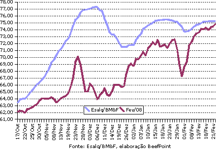 Nesta sexta-feira, o indicador Esalq/BM&F boi gordo à vista permaneceu estável, sendo cotado a R$ 75,22/@. O indicador a prazo também se manteve inalterado em R$ 75,98/@. Na BM&F, todos os vencimentos fecharam em alta. Fevereiro/08 teve valorização de R$ 0,42, fechando a R$ 74,90/@, com 2.205 contratos negociados e 5.109 contratos em aberto. Os contratos com vencimento em março/08 fecharam a R$ 72,00/@, alta de R$ 0,75. Outubro/08 apresentou variação positiva de R$ 0,80, fechando a R$ 74,42/@.