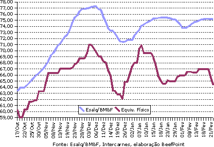 No atacado da carne bovina, os preços do traseiro (R$ 5,20) e dianteiro (R$ 3,60) recuaram R$ 0,10, enquanto a ponta de agulha permaneceu estável em R$ 3,00. Assim o equivalente físico foi calculado em R$ 64,35/@. Esta redução provocou novo aumento no spread (diferença) entre indicador de boi gordo e equivalente físico que está em R$ 10,87/@, valor acima da média dos últimos 12 meses, que é de R$ 6,17/@.