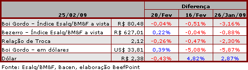 Na BM&FBovespa, o primeiro vencimento, fevereiro/09, fechou em baixa a R$ 80,54/@, com recuo de R$ 0,11, porém o mercado futuro segue pouco movimentado com poucos contratos sendo negociados. Os contratos com vencimento em maio/09, fecharam a R$ 74,63/@, com retração de R$ 0,42. Outubro/09 teve variação negativa de R$ 0,37, fechando a R$ 81,13/@, com 512 contratos negociados e 5.240 contratos em aberto.
