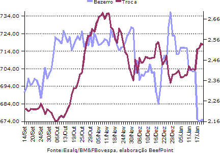Gráfico 3. Indicador Esalq/BM&FBovespa bezerro MS à vista (R$/cabeça)x relação de troca (boi gordo de 16,5@ por bezerros)