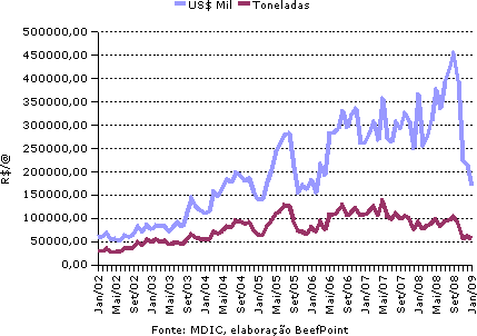 Em janeiro as exportações brasileiras de carne bovina in natura atingiram o volume de 56.600 toneladas e receita de US$ 168,5 milhões. Este volume o mais baixos desde fevereiro de 2004 - quando o Brasil enviou 54.201 toneladas ao exterior.