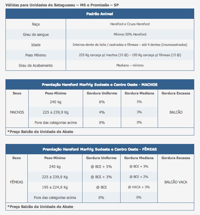 A certificação de carcaças nas duas regiões tiveram início nas plantas de Bataguassu (MS) e Promissão II (SP), a partir de dezembro 2012. Para participar, os animais devem ser da raça Hereford e cruza Hereford, com no mínimo 50% de grau de sangue, machos castrados (ou inteiros desde que com zero dente) e fêmeas com até quatro dentes, acabamento mínimo de 3mm (mediano) e peso mínimo de 225kg de carcaça para machos (15@) e 195kg para fêmeas (13@). Com a nova tabela, os animais podem obter bonificação de até 6% para machos e 5% para fêmeas sobre o valor de balcão da @ do boi na unidade.