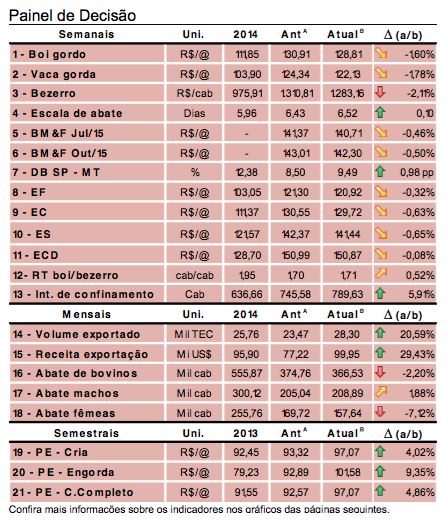 CONFINAMENTO APERTADO: Durante os meses de compra da maior parte dos insumos para o confinamento, foram constatados diferentes movimentos nos preços de itens utilizados. A média do preço da tonelada do farelo de soja no primeiro semestre deste ano foi 4,8% menor em comparação com o primeiro semestre de 2014, assim como a média da tonelada de milho, que ficou 5,5% mais baixa no mesmo período. Enquanto os ingredientes para engorda apresentaram relativa melhora nos preços para o confinador, o preço do boi magro subiu 32,2% entre os primeiros se- mestres. Além disso, a relação de troca boi gordo/boi magro piorou quase 6% no período, também por causa da baixa no preço da arroba, que entre maio e julho caiu 2,2%. A média, até a terceira semana de jul/15, da arroba do boi gordo ficou em R$ 128,6 e a relação em 1,23. Ou seja, neste patamar de preço da reposição, o confinador deve sentir os efeitos de uma menor rentabilidade este ano.