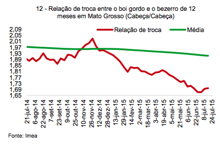 Relação estreita: Mato Grosso passa pela menor relação de troca entre o boi gordo e o bezerro de ano dos últimos sete anos. Este cenário vem se consolidando desde o ano passado na bovinocultura de corte mato- grossense. Em jun/15, com a venda de um boi gordo de 17 arrobas foi possível comprar 1,69 bezerro de ano. Essa relação está 14% abaixo da média dos últimos sete anos, e foi a menor desde 2008. Mesmo com a desvalorização da arroba no Estado no último mês, o atual momento do ciclo pecuário, caracterizado pela oferta escassa e alto preço dos bezerros, diminui essa relação. Esta realidade denota um cenário positivo para os investidores de cria, que acabam sendo bem remunerados por esse elo tão importante da cadeia. Por outro lado, o setor de engorda, tanto em pasto como no confinamento, pode contornar essa situação fazendo uma boa gestão em sua propriedade, com o intuito de minimizar o impacto dessa reposição mais onerosa.