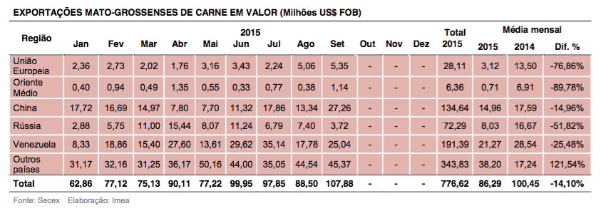 Retomando o nível: Mato Grosso registrou em set/15 o melhor resultado nas exportações em todo o ano. De acordo com os dados da Secretaria de Comércio Exterior (Secex), no mês de setembro, as exportações de carne bovina em equivalente carcaça cresceram 19,7%. Ao todo foram enviados ao exterior mais de 29 mil toneladas, valor este que foi, da mesma forma, 36,7% maior que o do mesmo período do ano anterior. Além de ser o maior volume embarcado em 2015, foi também o segundo melhor resultado para setembro em toda a série histórica que iniciou em janeiro/1996. Tal volume embarcado rendeu a maior receita de 2015, com US$ 107,8 milhões. Esse resultado deve-se, em grande parte, à desvalorização do real frente ao dólar, que chegou a 48,3% neste ano. Com isso, a carne mato-grossense ficou mais competitiva no exterior, ajudando a impulsionar as exportações e novamente emparelhar com os patamares históricos do último ano.
