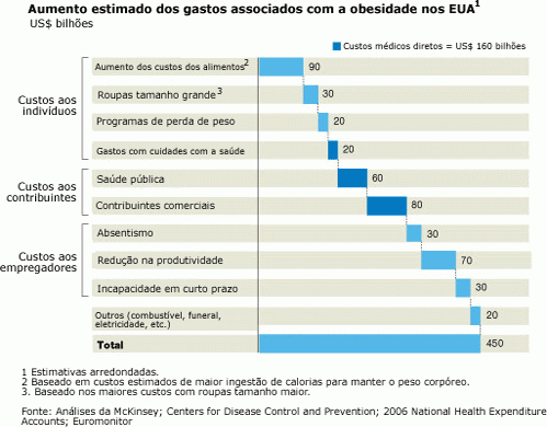 Uma pandemia de obesidade tem pressionado os sistemas de saúde em todo o mundo, de acordo com informações da firma de consultoria, McKinsey. O Reino Unido, por exemplo, gastou mais de 4 bilhões de libras esterlinas (US$ 6,39 bilhões) em custos médicos relacionados à obesidade em 2007 e isso poderá aumentar para 9,7 bilhões de libras esterlinas (US$ 15,51 bilhões) até 2050. Os Estados Unidos atualmente gastam cerca de US$ 160 bilhões - duas vezes o que gastaram na década anterior - e esse valor poderá dobrar novamente até 2018.