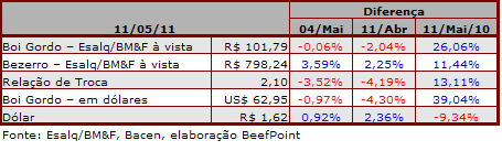 No Mato Grosso (Agua Boa-MT) o preço da @ do boi simplismente despencou, vendi uma carreta de boi para embarcar no dia 19/05/2011 por R$ 84,00 com 30 dias, a duas semanas atrás este preço estava em R$ 87,00, ou seja, queda de 3,57%. Mas o pior de tudo é a reposição que não esta acompanhando a queda do mercado do boi gordo, comprei um lote de bezerro nelores de 8 meses a R$ 680,00, este preço se mantém desde fevereiro de 2011.