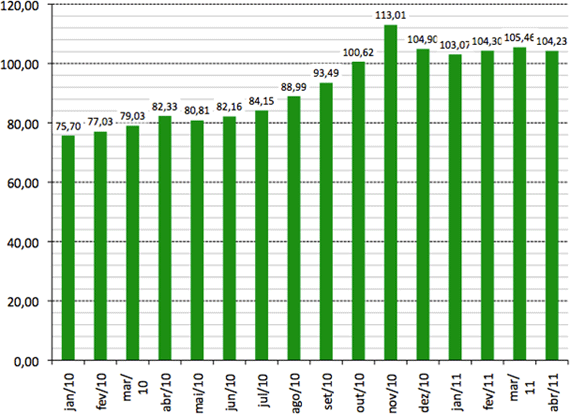 Os primeiros quatro meses mostram um mercado muito firme para a pecuária de corte. Os preços do boi gordo passam grande parte da safra muito estáveis, quando tradicionalmente há queda de preço. Em relação ao ano passado, o patamar do indicador Cepea/Esalq está na casa dos R$103-105/@, muito acima dos valores de jan-abr de 2010 – R$75-82/@. O boi subiu até novembro-2010 e se manteve em outro patamar de preços desde então. Uma demonstração de firmeza de preços.