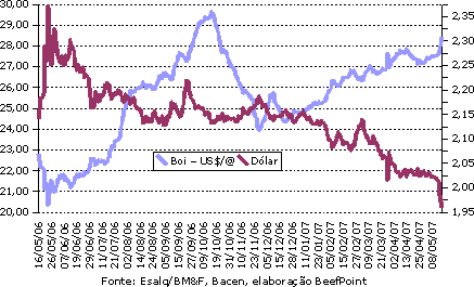 Gráfico 2. Boi gordo em dólares e cotação do US$, desde 16/05/2006