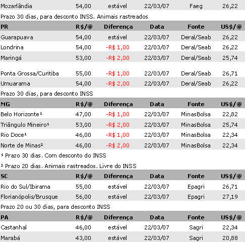 Falta informações sobre preços de animais mais qualificados para corte tais como: bezerros cruzados de 200a 220kg aos 8m, e Bezerras do mesmo padrão com 180 a 200kg aos 8m.