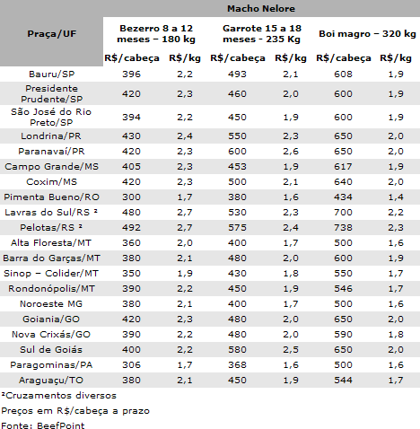 No mercado físico, alta em muitas regiões brasileiras. SP, MS e GO tiveram fortes altas no físico, que deve ser acompanhado por outras regiões. Veja na tabela abaixo as praças com alteração. Para acessar a tabela completa e os preços de reposição e vaca gorda, acesse a seção Cotações do BeefPoint.