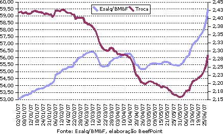 Gráfico 3. Indicador Esalq/BM&F e contratos futuros do boi gordo (valores à vista), em 27/06/07