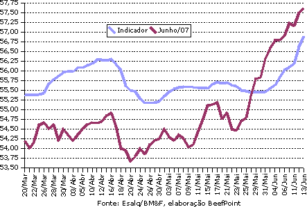 No mercado futuro, a semana foi novamente de forte alta, com o contrato para outubro/07 fechando a quarta-feira em R$ 63,85/@. Usando-se a cotação atual do dólar, isso equivale a US$ 32,85/@. O contrato para junho/07 está cotado em R$ 57,62/@, acima do indicador. Ou seja, o mercado acredita em valorização do preço do boi gordo no curto e médio prazo.