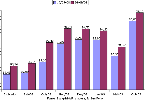 Gráfico 4. Indicador Esalq/BM&F e contratos futuros de boi gordo (valores à vista), em 17/09/08 e 24/09/08