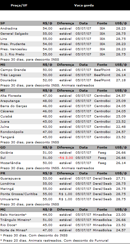 Cotações do Mercado Físico da Vaca Gorda, nas praças levantadas pelo BeefPoint.