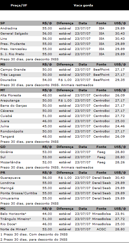 Cotações do Mercado Físico da Vaca Gorda, nas praças levantadas pelo BeefPoint.
