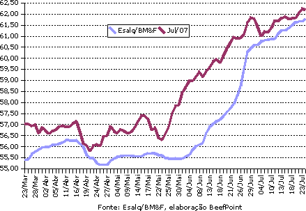 O indicador Esalq/BM&F boi gordo à vista foi cotado a R$ 61,80/@, alta de R$ 0,14, o indicador a prazo foi cotado a R$ 62,55/@. Na BM&F, o primeiro vencimento, julho/07 teve queda de R$ 0,07, fechando a R$ 62,18/@, com 825 contratos negociados e 6.971 contratos em aberto. Setembro/07 fechou a R$ 63,56/@, variação positiva de R$ 0,05, com 438 contratos negociados e 6.550 contratos em aberto. Os contratos com vencimento para outubro/07 tiveram alta de R$ 0,02, fechando a R$ 64,24/@, com 599 contratos negociados e 23.325 contratos em aberto.