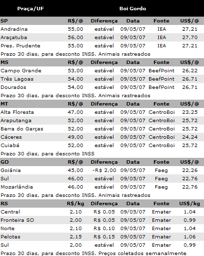 Tabela 2. Resumo das cotações do mercado físico do boi gordo 09/05/2007