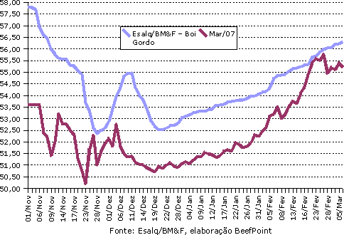 O indicador Esalq/BM&F fechou mais um dia em alta, cotado a R$ 56,32/@ com variação de R$ 0,09. No mercado futuro novo recuo, com o primeiro vencimento, março/07, fechando a R$ 55,19/@ (- R$ 0,22) e outubro/07 a R$ 60,83/@(- R$ 0,27). O contrato que registrou maior queda foi julho/07 que fechou a R$ 56,60/@, com baixa de R$ 0,40.