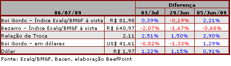Na BM&FBovespa, os contratos de boi gordo apresentaram forte valorização. O primeiro vencimento, julho/09, teve alta de R$ 0,89, fechando a R$ 83,52/@. Os contratos que vencem em outubro/09 fecharam a R$ 88,31/@, com valorização de R$ 1,02.