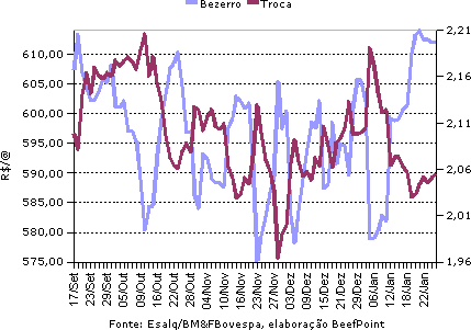 Na reposição, o indicador Esalq/BM&FBovespa bezerro MS à vista foi cotado a R$ 611,81/cabeça, registrando um recuo de 0,21% na semana. Em relação ao mesmo período do ano passado a variação acumulada é de -3,24%. Com os indicadores de boi gordo (+0,87%) e de bezerro (-0,21%) andando para lados opostos, a relação de troca subiu para 1:2,06.