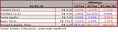 A BM&FBovespa também registrou queda durante a semana. As exceções foram os contratos de setembro/10 (estável) e novembro/10 (+R$ 0,21), porém o volume de negócios para estes dois vencimentos foi muito baixo. Março/10 fehou a R$ 77,34/@ na quarta-feira, com desvalorização de R$ 0,81. Os contratos que vencem em outubro/10 tiveram recuo de R$ 0,69, fechando a R$ 83,07/@ no último pregão.