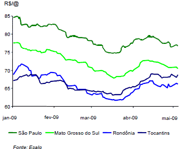 O 1º trimestre/09 foi de continuidade na redução do preço médio do boi gordo no Brasil, com a arroba variando -7,2% em relação ao 4º trimestre/08, mas num patamar ainda maior que o do 1º trimestre/08. A acomodação no preço da arroba é reflexo, principalmente, da racionalização da indústria, que acabou por melhorar a dinâmica entre a oferta e demanda por boi gordo e da queda nos preços e volumes de exportação da carne com a crise global.
